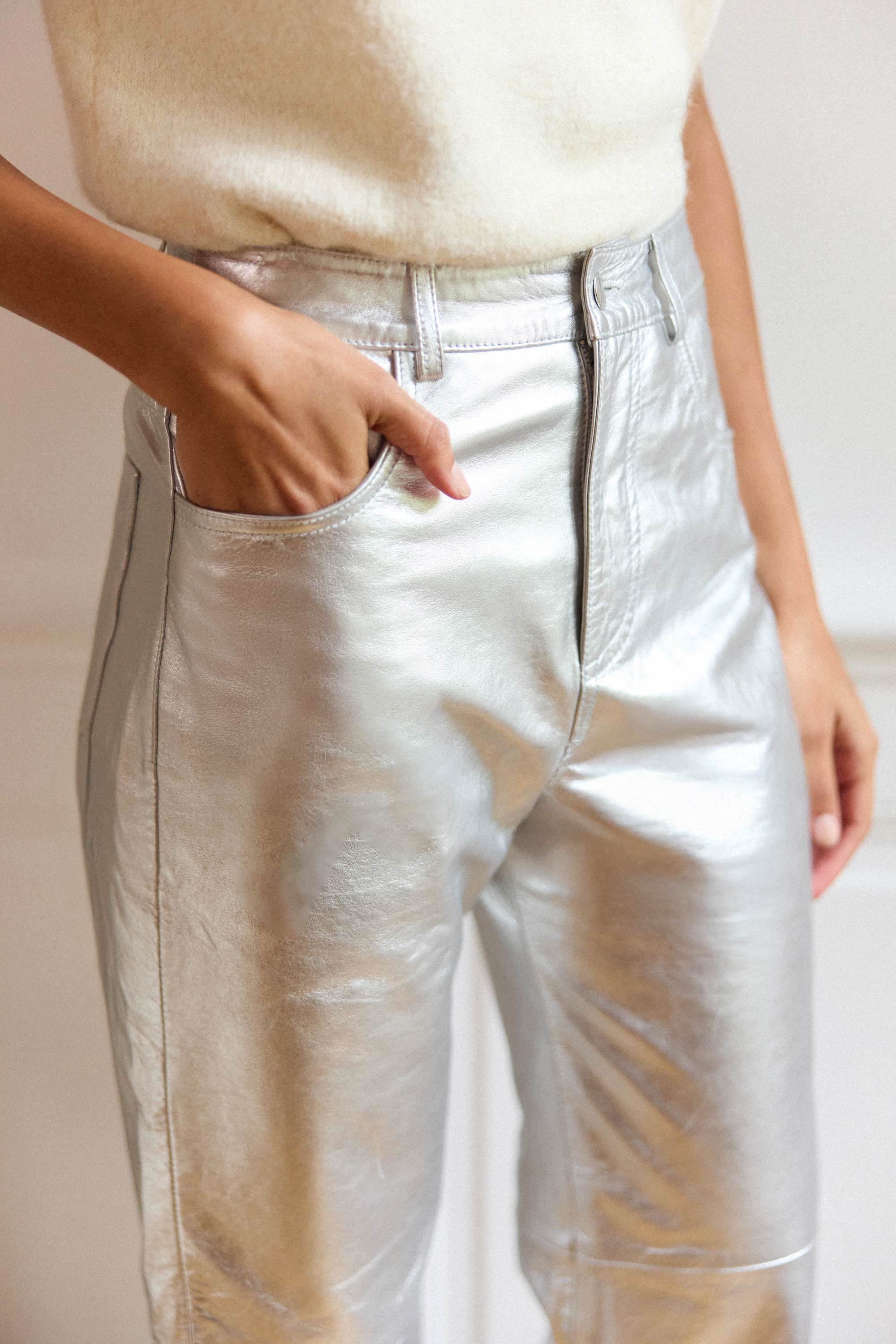 Zephyr, un pantalon droit en cuir argenté, taille haute avec poches et fermeture zippée à la ceinture, pour un look audacieux et tendance.