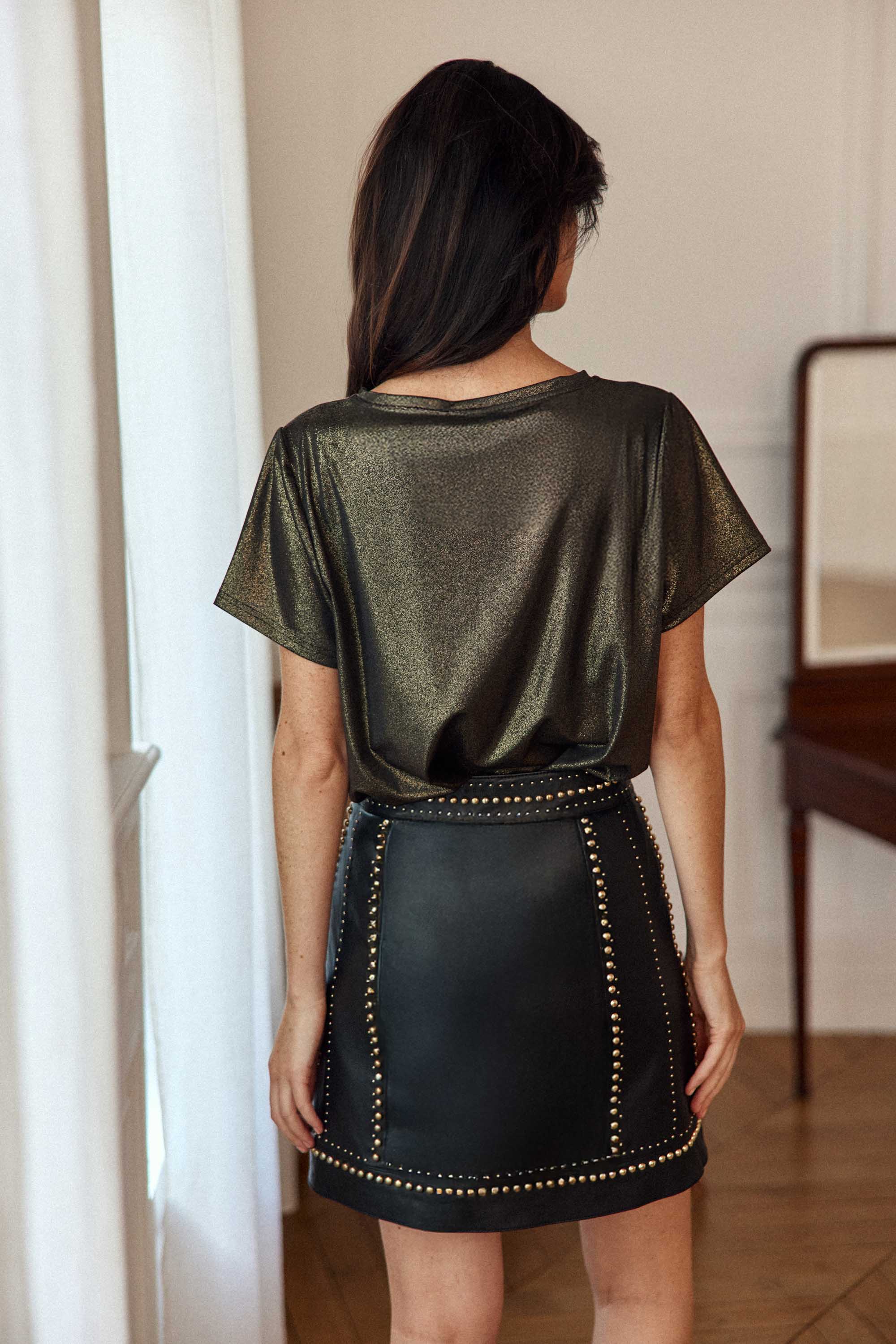 Tia, un t-shirt droit et ample en tissu lurexé mordoré, avec encolure ronde et manches courtes, idéal pour rehausser une tenue.