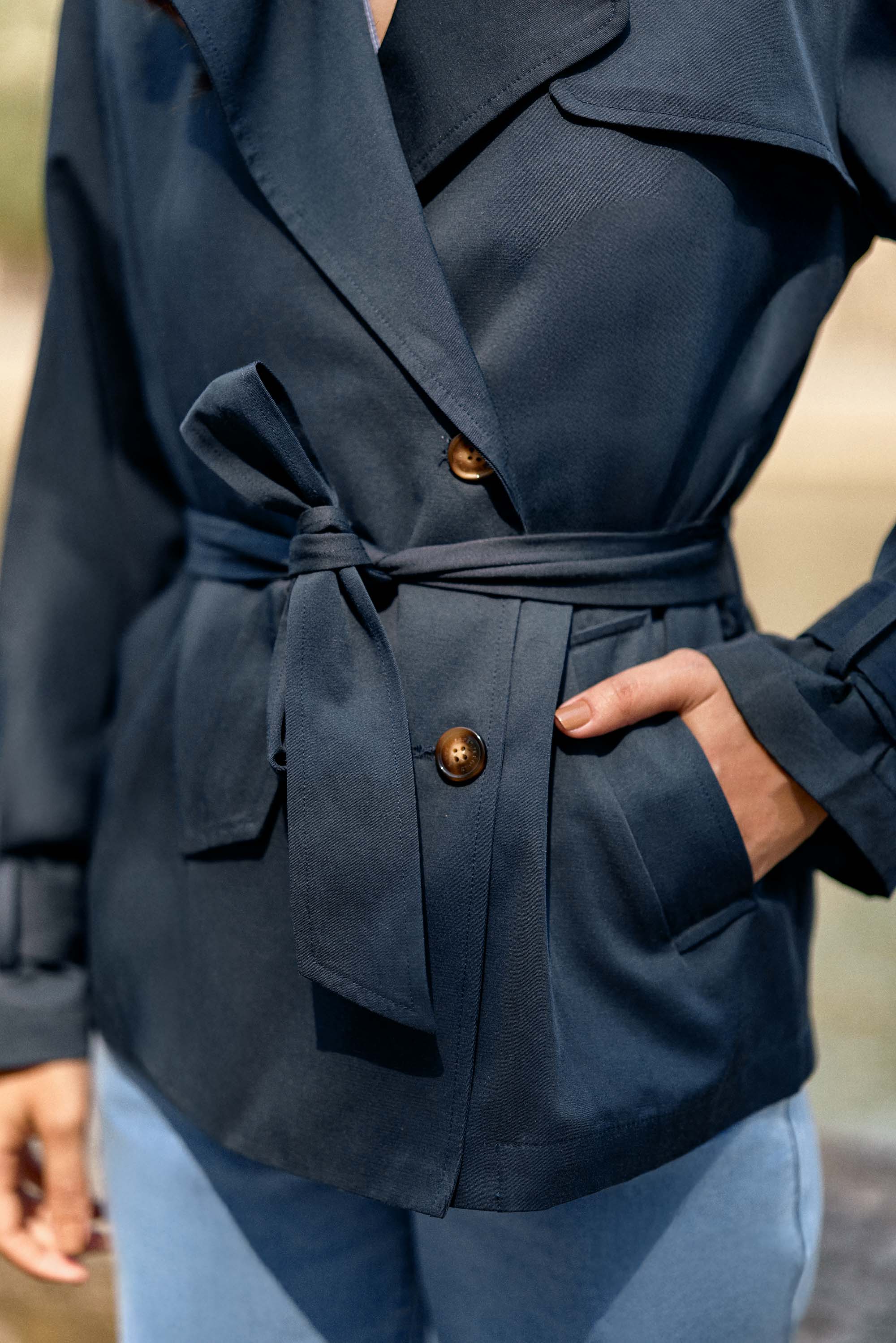 Narago, le trench court en tissu déperlant marine, avec col revers, double boutonnage et ceinture amovible.